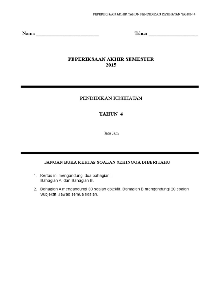 Related : Soalan Akhir Tahun Pendidikan Kesihatan Tahun 4 / .tahun 1 hingga tahun 6 atau pautan download media atau bahan bantu mengajar yang berbentuk softcopy seperti gambar, video, soalan, pekeliling, bahan bantu mengajar dan media lainnya di blog sksungaitong ini adalah ulangsiar dari beberapa laman blog dan website pendidikan di malaysia..