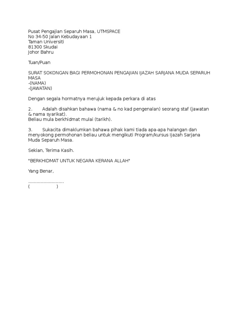 Related : Contoh Surat Sokongan Permohonan Kerja / Contoh Surat Sokongan Permohonan Penduduk Tetap Contoh Surat - Tiada dokumen sokongan yang diperlukan..